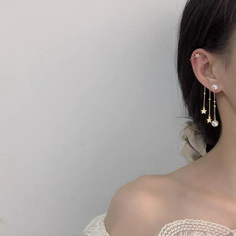 Feature SpecificationMaterialAlloyCraftElectroplatingColorPearl Chain Ear ClipStyleChanel-styleDesignCreative Long Tassel Pearl Ear Clip, Asymmetric Star Earring