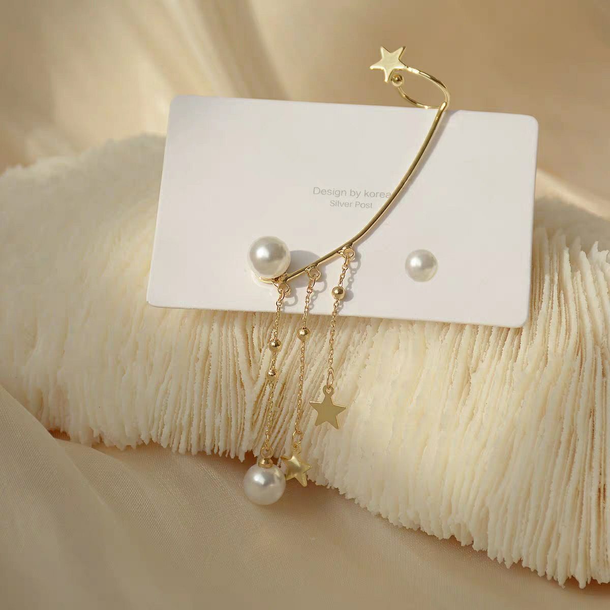 Creative Long Tassel Pearl Ear Clip, Asymmetric Star Earring